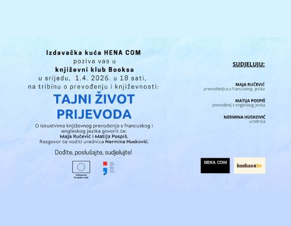 Izdavačka kuća HENA COM vas poziva na drugu tribinu o prevođenju i književnosti Tajni život prijevoda. Uz osvrt na rad u ovoj vrlo specifičnoj branši, prevoditelji će s vama podijeliti svoja iskustva književnog prevođenja, mnoge izazove i probleme s kojima su se susretali te svoje poglede na to što književni prevoditelj danas jest, a što bi možda trebao biti.