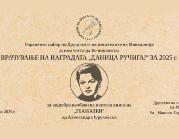 Dobitnica ovogodišnje makedonske pjesničke nagrade Danica Ručigaj za najbolji neobjavljeni pjesnički rukopis je zbirka Tkažalki autorice Aleksandre Jurukovske. Društvo pisaca Makedonije (DPM) ove godine, povodom desete obljetnice utemeljenja nagrade, po prvi put priznanje dodjeljuje neobjavljenom rukopisu.