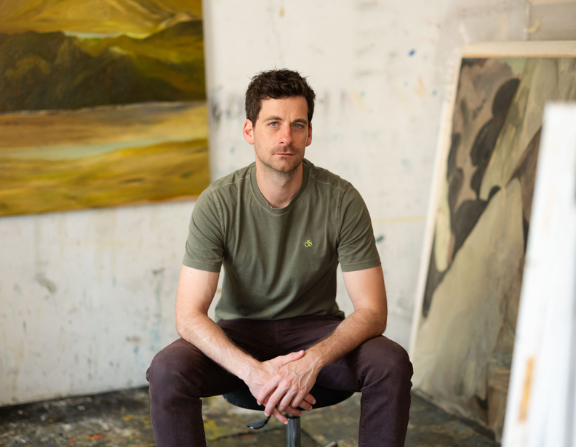 Za slikarstvo Domagoja Rogine, posebno novije, na prvi pogled se ne bi moglo reći da ima izraženu narativnu stranu. Međutim, ako obratimo pozornost na njegovu ustrajnost u slikanju prepoznatljivih motiva poput planina, nastambi ili skloništa kao što su kuće, kolibe ili šatori, ili pak morskih pasa koji su mu svojedobno bili gotovo „zaštitni znak“, postat će jasnije zašto je idealan gost Vizualnog salona. Naime, usporedno s obogaćivanjem i nijansiranjem svog slikarskog postupka, koji je pažljivo čistio od stilskih rješenja bližih ilustraciji nego slici (mada pisane predloške u užem smislu nikada nije imao) i doveo ga do osebujne stilizacije kojom motive s lakoćom preobražava u prizore, a ponekad i znakove transcendentnih svojstava, Rogina je svoje teme dosljedno ulančao u niz arhetipskih slika koje tvore i sasvim osobnu i izrazito univerzalnu mitologiju. Na to upućuju i naslovi slika iz recentnih ciklusa Tlo (2023.–2024.) i Mekani vrhovi (2024.–2025.), gdje se katkad javljaju izravne (Kuća Joba) i neizravne (Posljednja planina) biblijske reference, odnosno jednostavni i efektni jezični kontrasti (Dan i noć, Podzemno more), kao i epiteti koji upotpunjuju sirovu snagu i pritajenu monumentalnost slike bez obzira na njene dimenzije (Narančasti portal, Skriveno mjesto). Bez sumnje se radi o prispodobama proizašlim iz slikarevog unutarnjeg krajolika, pa je na tom tragu nebitno jesu li za izbor pojedinog od navedenih motiva ili pejzaža okidači bili konkretni prizori, pojave ili doživljaji. Puno je važnije to što, promatrajući Roginine slike, slutimo da su posrijedi pozivi na putovanje ili točnije rečeno, postaje na putu koji nas očekuje ako njegovom viđenju sveobuhvatnih motiva dopustimo da otključaju parove što zasigurno postoje u nama. U toj magiji zbiva se razmjena o kojoj ćemo popričati na Booksinom kauču.