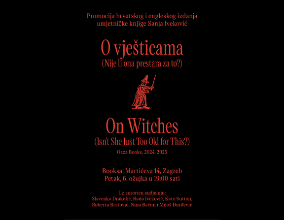 Institut Sanja Iveković vas poziva na predstavljanje hrvatskog i engleskog izdanja umjetničke knjige Sanje Iveković, O vješticama (Nije li ona prestara za to?) / On Witches (Isn't she just too old for this?) (Oaza Books, 2024, 2025). Na promociji će, uz autoricu, sudjelovati Slavenka Drakulić, Rada Iveković, Kate Sutton, Roberta Bratović, Nina Bačun i Miloš Đurđević.